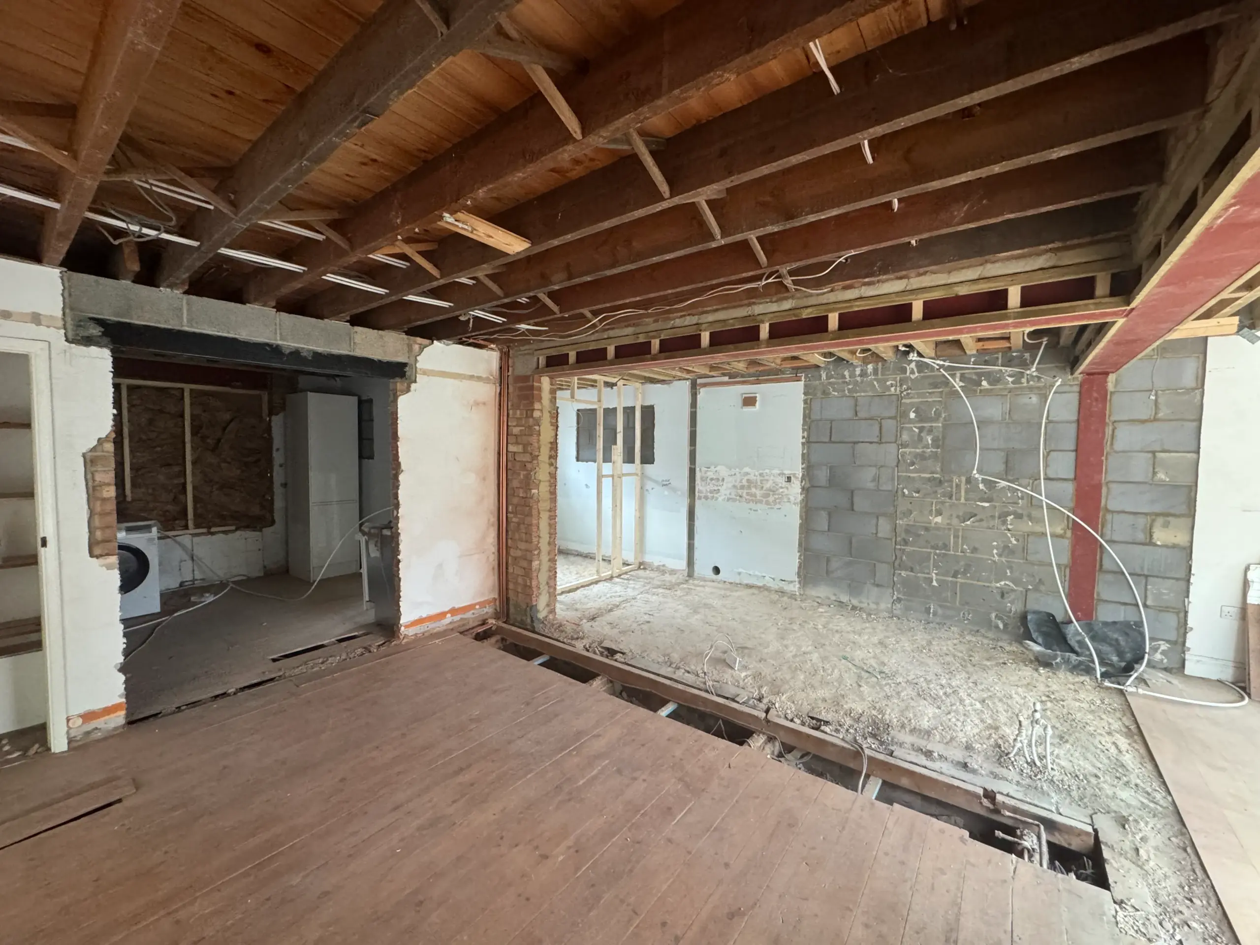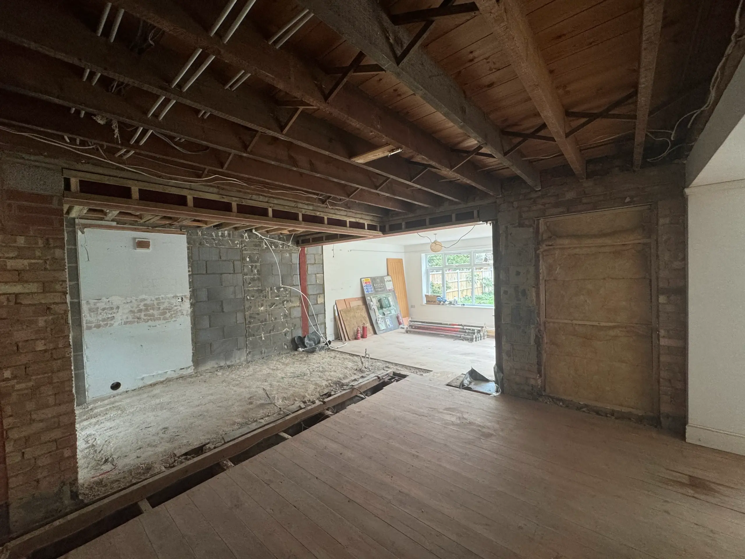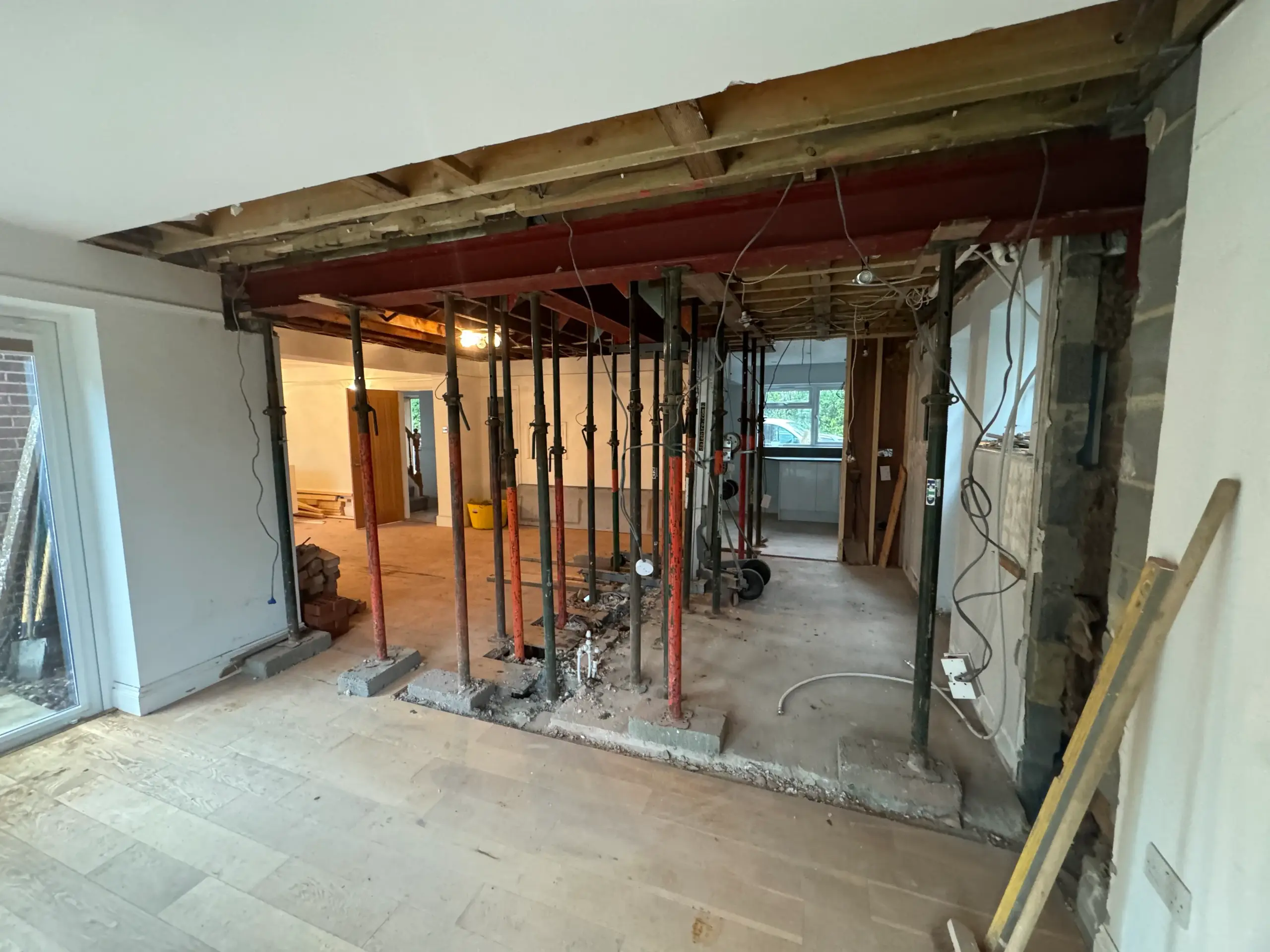 - Installed steel beams (RSJs) with padstones and posts where needed, then made good floors/ceilings.