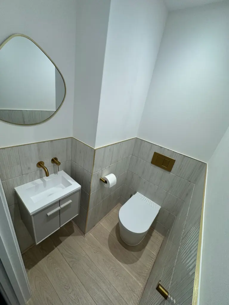 - Fitted sanitaryware, showers, brassware and extraction; tanked wet areas before tiling.